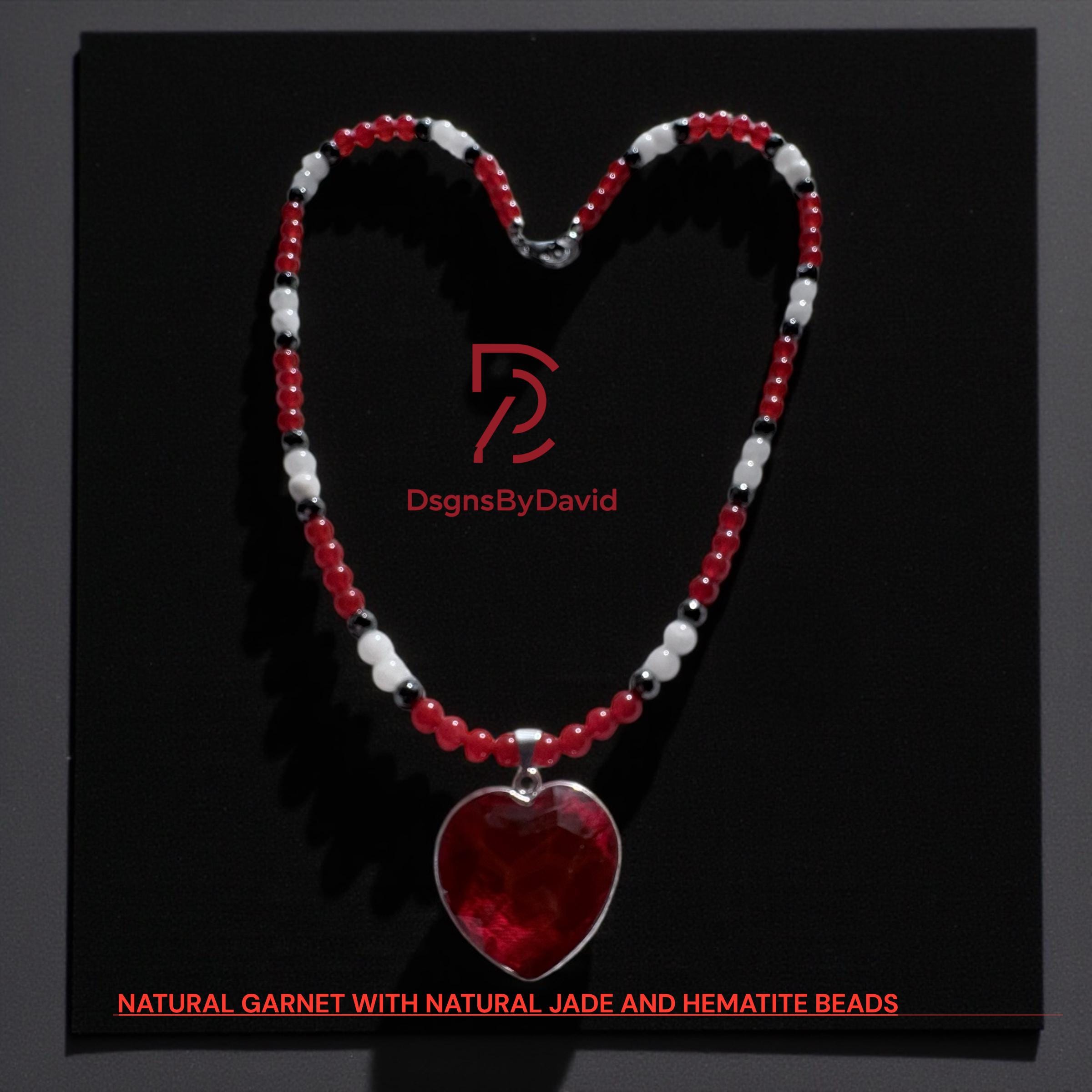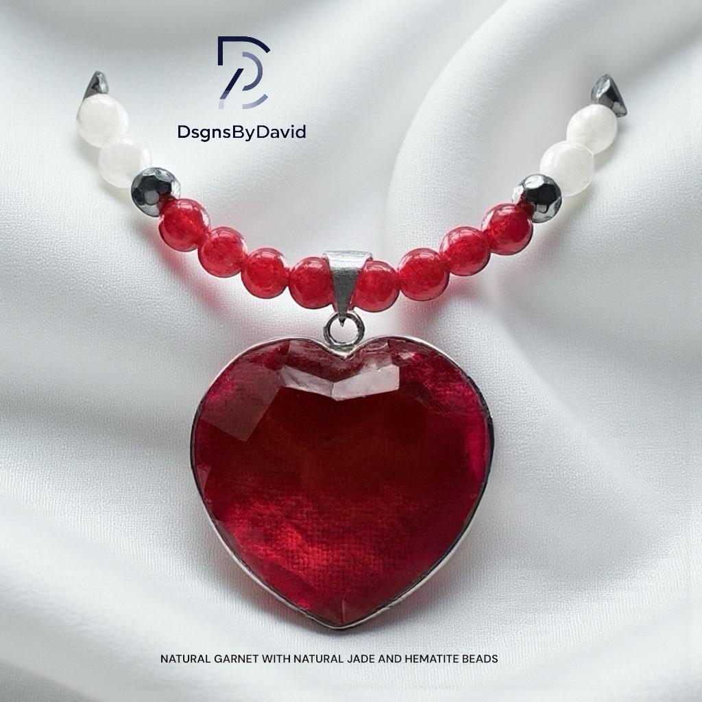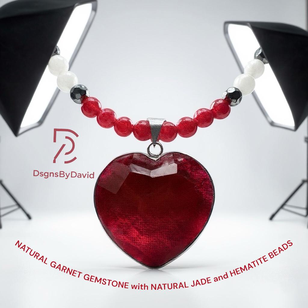 An all NATURAL RED, HEART SHAPE GARNET 20" beaded necklace. Beads are NATURAL RED and WHITE JADE and NATURAL HEMATITE beads. Pendant is set in 925 Sterling Silver.