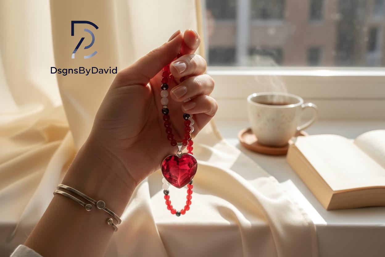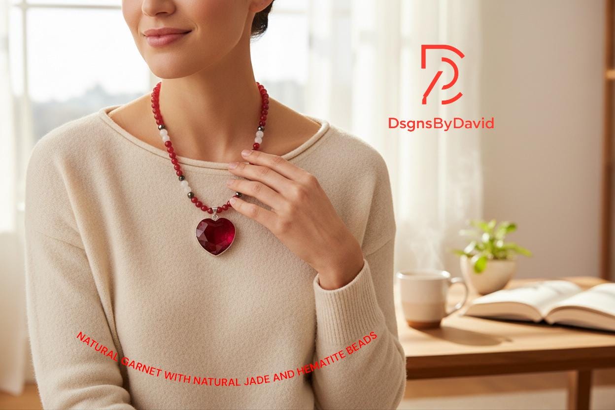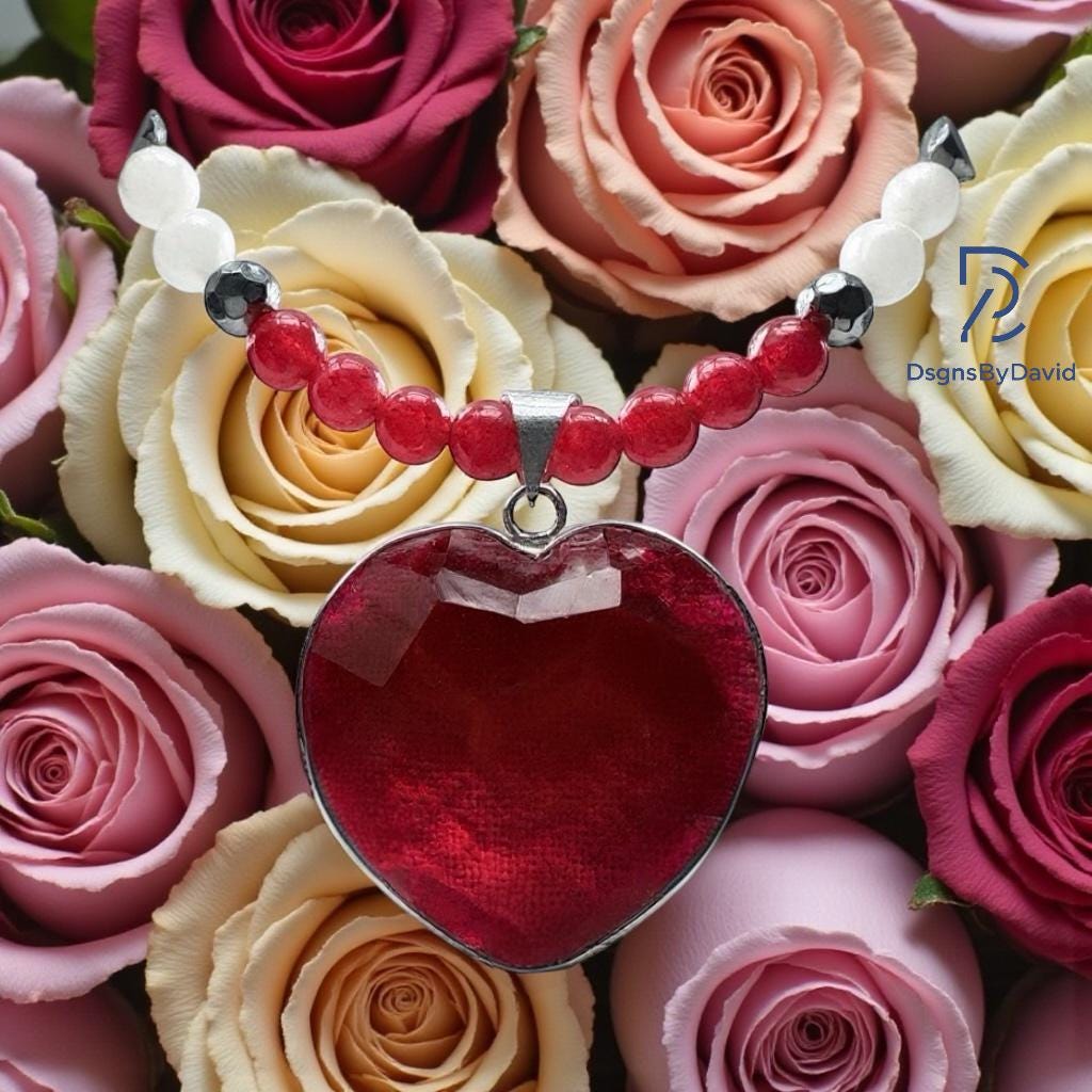 An all NATURAL RED, HEART SHAPE GARNET 20" beaded necklace. Beads are NATURAL RED and WHITE JADE and NATURAL HEMATITE beads. Pendant is set in 925 Sterling Silver.
