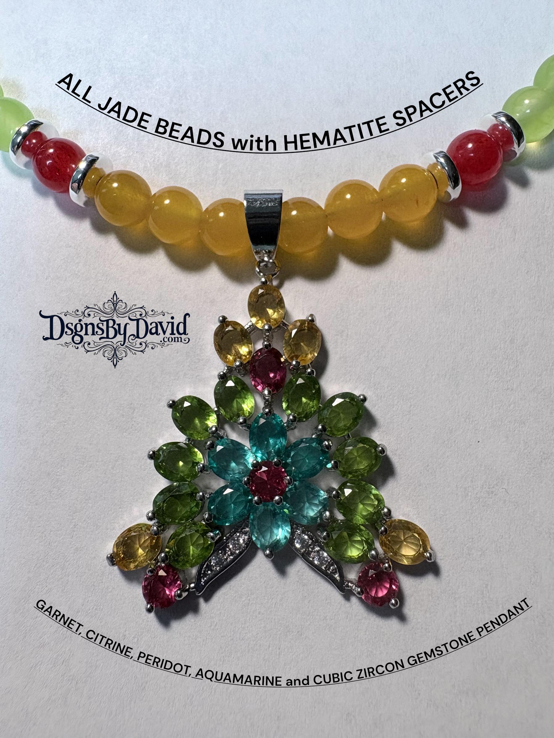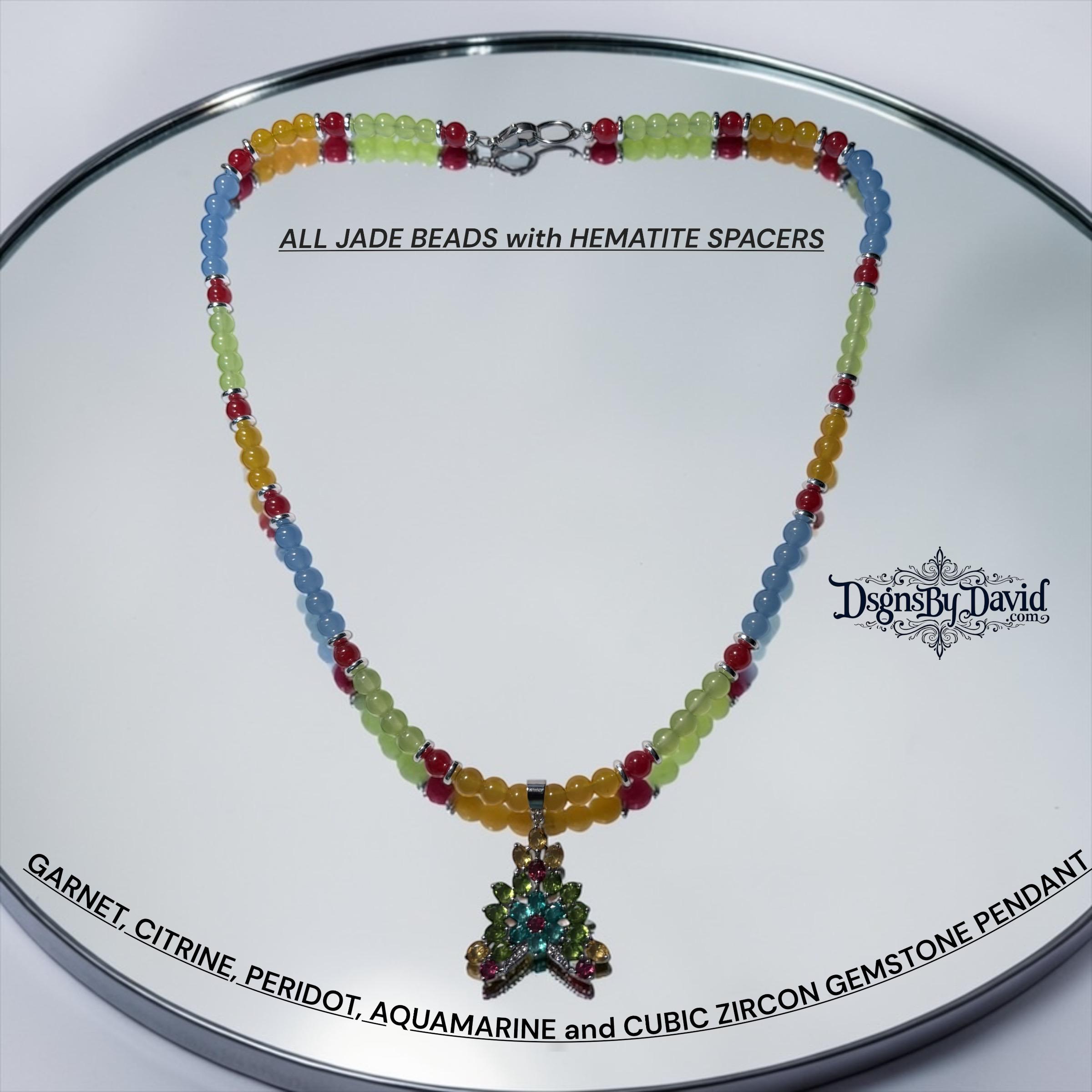A Natural Multi-Color Gemstone Pendant with Garnet, Citrine, Peridot, Aquamarine and Cubic Zircon Stones. Beads are all NATURAL Jade with Natural Hematite Spacers. Necklace is 23" in length and on a 925 Silver Base.