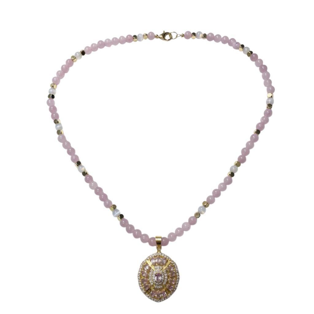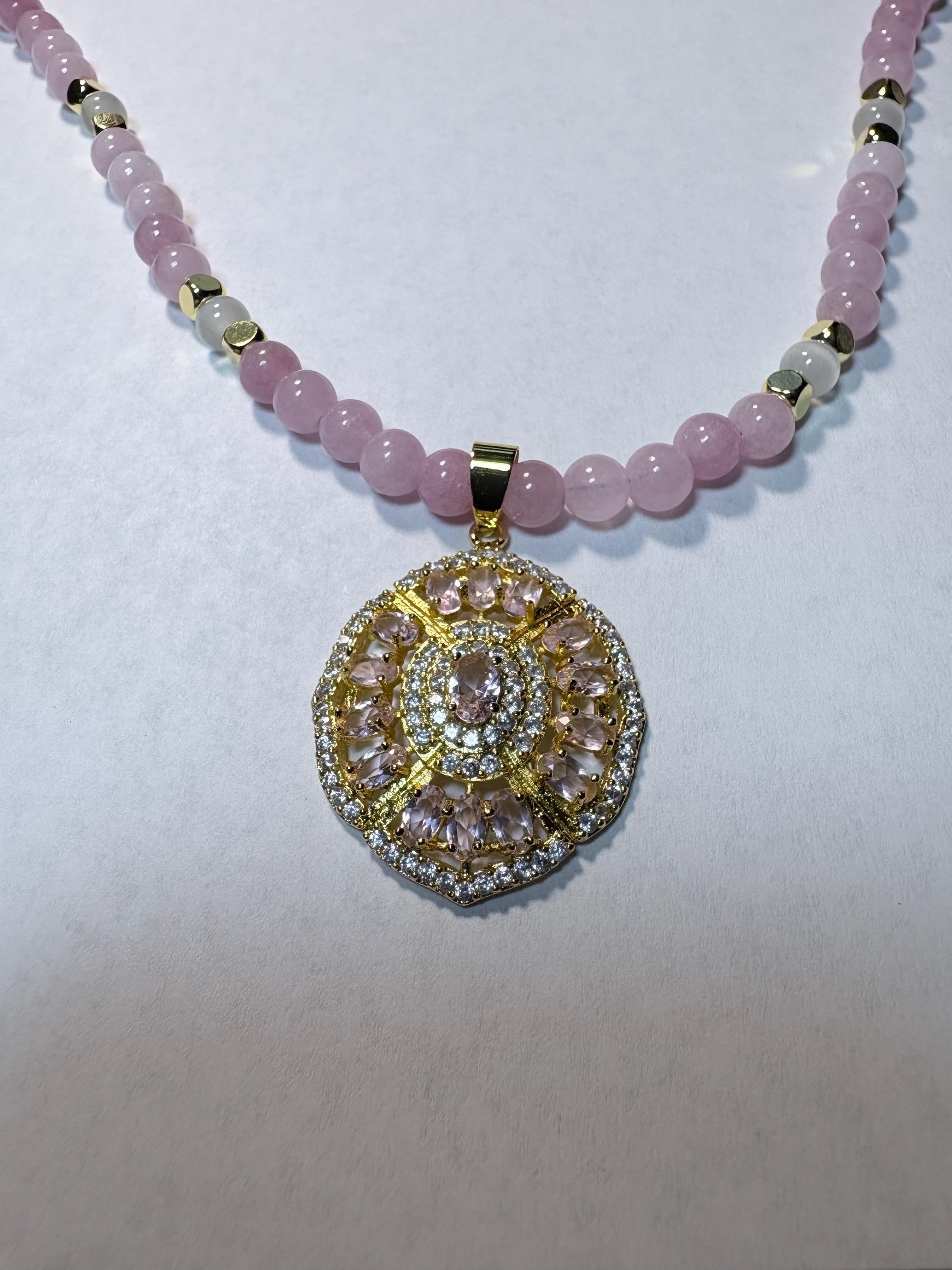 Beautiful Pink Kunzite and White Cubic Zircon Gold Pendant. Beads are Pink Kunzite and Selenite with 18K gold spacers. This necklace is 20" in length.