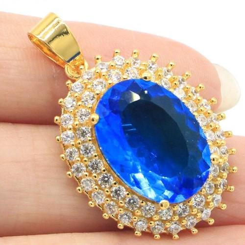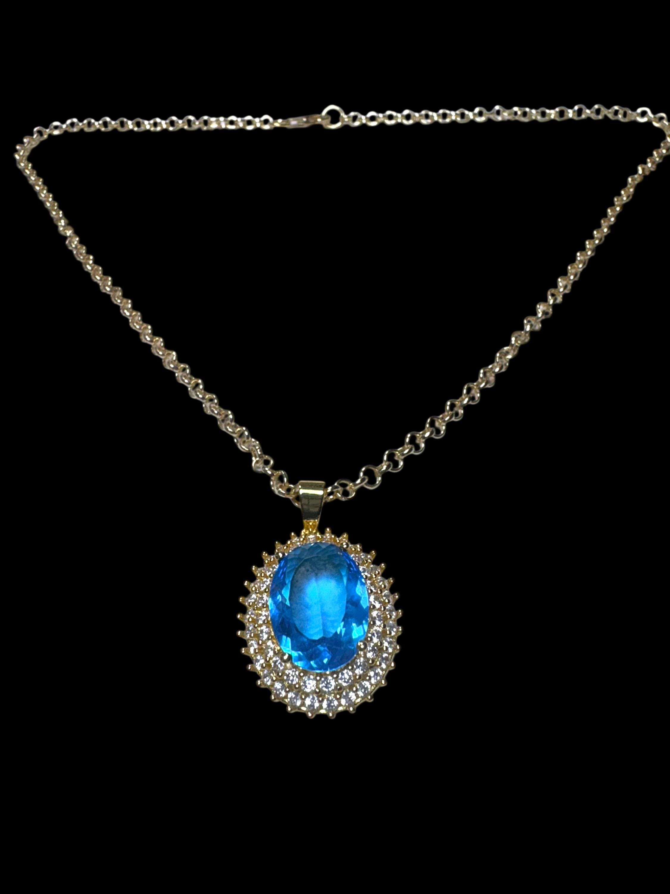 This Golden SWISS BLUE STUNNING TOPAZ pendant with Cubic Zircon Gemstones is considered to be an empathic pendant that soothes, heals, recharges and re-centers the wearer. Swiss Blue Topaz is believed to promote truth and forgiveness. This color Topaz has been forever a symbol of prosperity, communication and clear thinking. The brilliant color of Swiss Blue Topaz makes it a beautiful jewel to be worn in a necklace for Holidays or Everyday Wear.