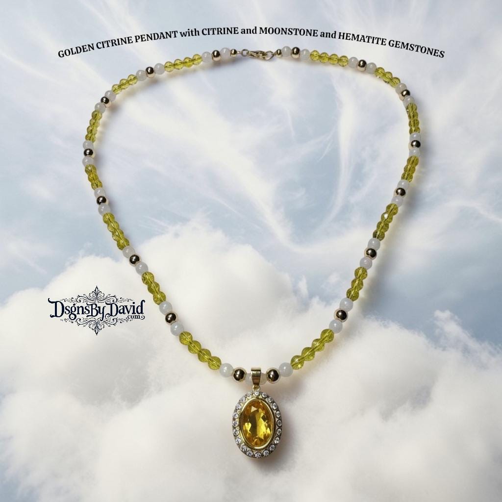 This DELUXE GOLDEN CITRINE GEMSTONE Pendant surrounded by SPARKLING CUBIC ZIRCON Stones on a HANDMADE BEADED Necklace with CITRINE, MOONSTONE and HEMATITE Gemstone BEADS. Necklace is 24" in length.